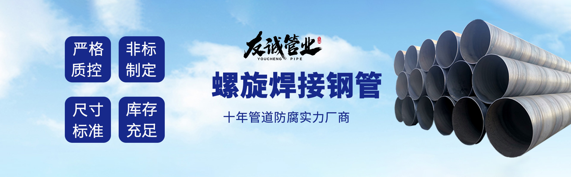 滄州友誠(chéng)管業(yè)有限公司是一家專(zhuān)業(yè)從事生產(chǎn)防腐涂塑管道及管件于一體的大型企業(yè)。公司注冊(cè)資金8600萬(wàn)元,位于中國(guó)管道生產(chǎn)基地—河北鹽山縣,近靠京滬高速、榮烏高速、黃石高速30公里,高鐵滄州西站40公里,天津國(guó)際機(jī)場(chǎng)、濟(jì)南遙墻機(jī)場(chǎng)150公里,為客戶(hù)來(lái)訪(fǎng)及業(yè)務(wù)發(fā)展提供了便利的交通條件。 鋼管系列:螺旋鋼管、無(wú)縫鋼管、ERW直縫焊管、JCOE埋弧焊直縫鋼管、熱鍍鋅鋼管。 涂塑系列:內(nèi)外涂塑鋼管、涂塑復(fù)合鋼…… 了解更多